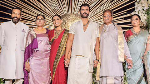 నాయికలు కృతిసనన్, మృణాల్ ఠాకూర్, కృతిశెట్టి, శ్రీలీల కూడా ఈ వేడుకకు హాజరై నూతన దంపతులకు శుభాకాంక్షలు తెలిపారు. రాజకీయ రంగానికి చెందిన మాజీ మంత్రులు హరీశ్రావు, మల్లారెడ్డి, సబితా ఇంద్రారెడ్డి, తలసాని శ్రీనివాస్ యాదవ్ తదితరులు కూడా ఈ కార్యక్రమంలో పాల్గొన్నారు. తాము ఇద్దరం కలిసి కొత్త జీవితాన్ని ప్రారంభించామని, అందరి ఆశీస్సులు ఎప్పుడూ తమపై ఉండాలని విజయ్ దేవరకొండ - రష్మిక దంపతులు కోరుకున్నారు. ఇటీవలే వివాహ బంధంతో ఒక్కటైన ఈ జంట బుధవారం హైదరాబాద్లో మీడియా ప్రతినిధులతో ప్రత్యేకంగా మాట్లాడింది.